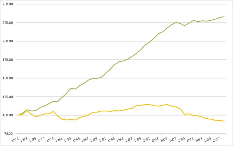 Figure 2: Productivity (Output per Hour, seasonally adjusted), green line, and UK Inland Energy Consumption, yellow line, 1971 to 2018, 1971=100. Source: ONS, DUKES 2019, chart by the author.